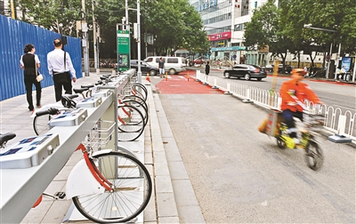 据介绍,慢行系统改造主要建设内容包括:铺设自行车彩色防滑路面,实施自行车道后绕公交车站改造,设置机非隔离护栏,施划标志标线,设置车道标志等。全部工程预计今年11月底前完成。