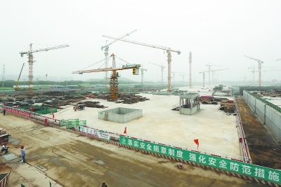 昨天,在市排水集团槐房再生水厂建设工地,施工正紧张进行。水厂建成后,地面部分将修建成大型湿地公园。地下部分为再生水生产车间,主要承担城南地区污水处理的任务。本报记者 饶强摄