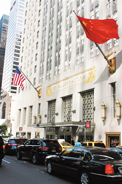 纽约华尔道夫酒店门前五星红旗与星条旗飘扬。
