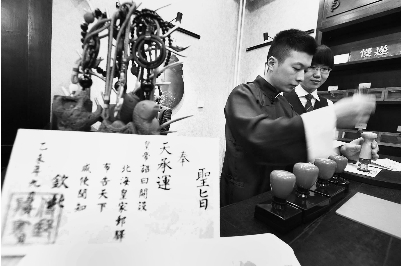 今天上午,北海皇家邮驿在北海公园东岸的碧海楼揭幕。记者在现场看到,邮局工作人员身着古式长袍为游客收发信件、盖戳。在邮驿门口,一座仿古盘龙造型的“大清邮政”邮筒和投递雕塑画面,吸引了众多游客合影留念。据工作人员介绍,这个邮筒和普通邮筒一样,承担着接收信件的功能。