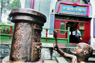 千龙—法晚联合报道 在特定的节日里,从皇家园林驿站中将信件寄出,这是集邮爱好者和文艺浪漫人士长期的愿望。9月28日上午,北京市首家开在皇家园林中的邮局——北海皇家邮驿开业。
