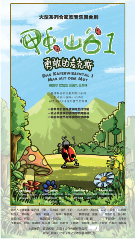 一部儿童剧,不仅能让中国小观众们感受到德国当代童话的魅力,还能让他们体验到德式戏剧教育的精髓,更能让他们成为该舞台剧的演员,去国内各地乃至海外各国进行巡回演出。这不是天方夜谭,今年的六·一儿童节,在首都北京的舞台上,开启全球首演的系列合家欢音乐舞台剧《甲虫山谷》就会把这一切逐步变为现实!5月23日、24日在北京中间剧场,5月30日、31日和6月1日在北京大隐剧院,该剧将隆重上演。