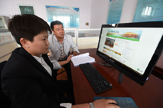 9月24日,在临泽县新华镇向前村农村产权交易服务站,工作人员查看农村产权交易平台相关信息。