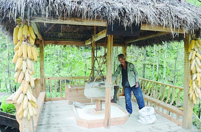 近年来,康县把体现乡愁、留住记忆作为美丽乡村建设的升级版,相继恢复了一批磨坊、纸坊等建筑。图为白杨乡朱家沟村群众在水磨坊里磨面。