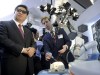 习近平和约克公爵和帝国理工学院最新开发的医疗机器人互动,这其中包括一个运用于外科手术的蛇形机器人。哈姆林中心的教授将展示帝国理工学院怎样研究出更小、更便宜的机器人,帮助医护工作者以更小的成本和史无前例的精确度做手术。图为习近平戴着3d眼镜观看医疗设备的展示。