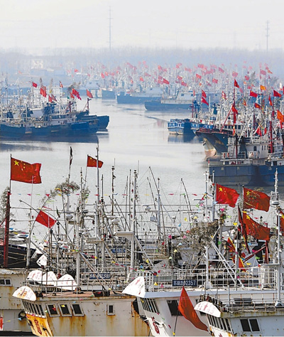 2月7日,农历除夕,江苏连云港市赣榆区青口中心渔港,靠岸的千余艘渔船挂起崭新的国旗,迎接新春佳节的到来。 |