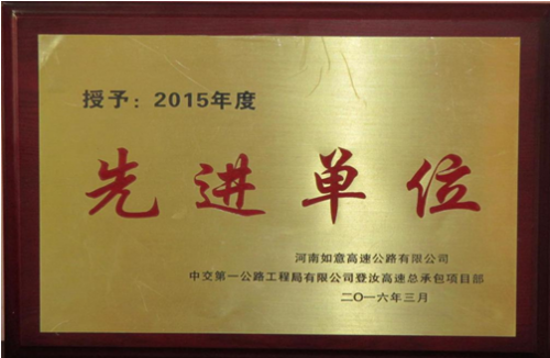 (记者常魁星)春暖花开传喜讯。4月6日,河南如意高速公路有限公司表彰了2015年度登汝高速公路工程建设“先进单位”,中交一公局交通工程有限公司登汝高速公路交安项目在八个项目中脱颖而出,被授予“先进单位”荣誉称号,获得奖金五十万元。