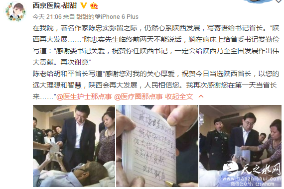 网友@西京医院-甜甜 发布微博称,著名作家陈忠实弥留之际写寄语给陕西书记省长,祝贺他们履职,希望他们给陕西乃至全国发展作出伟大贡献。