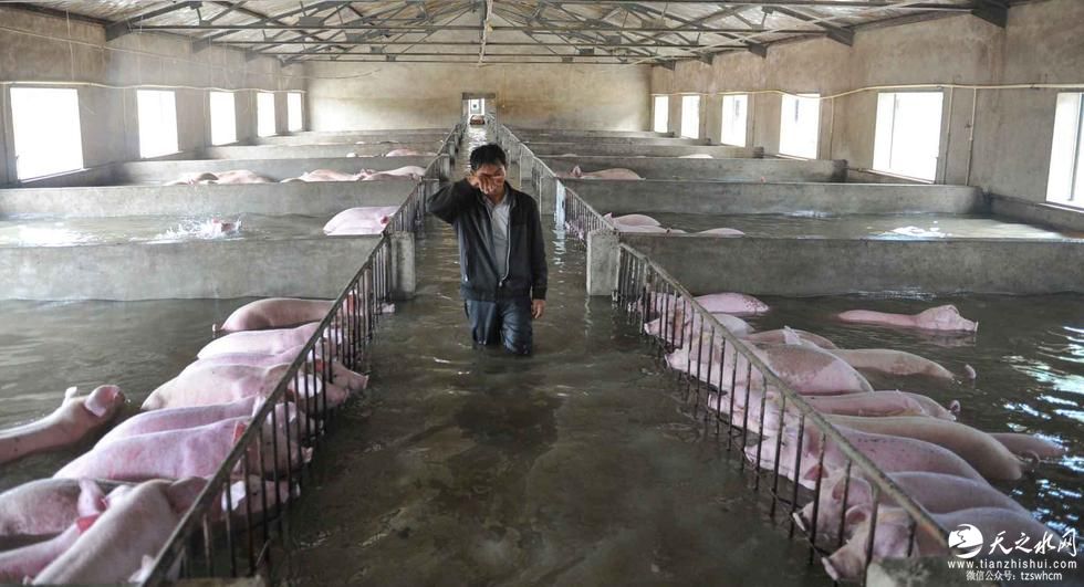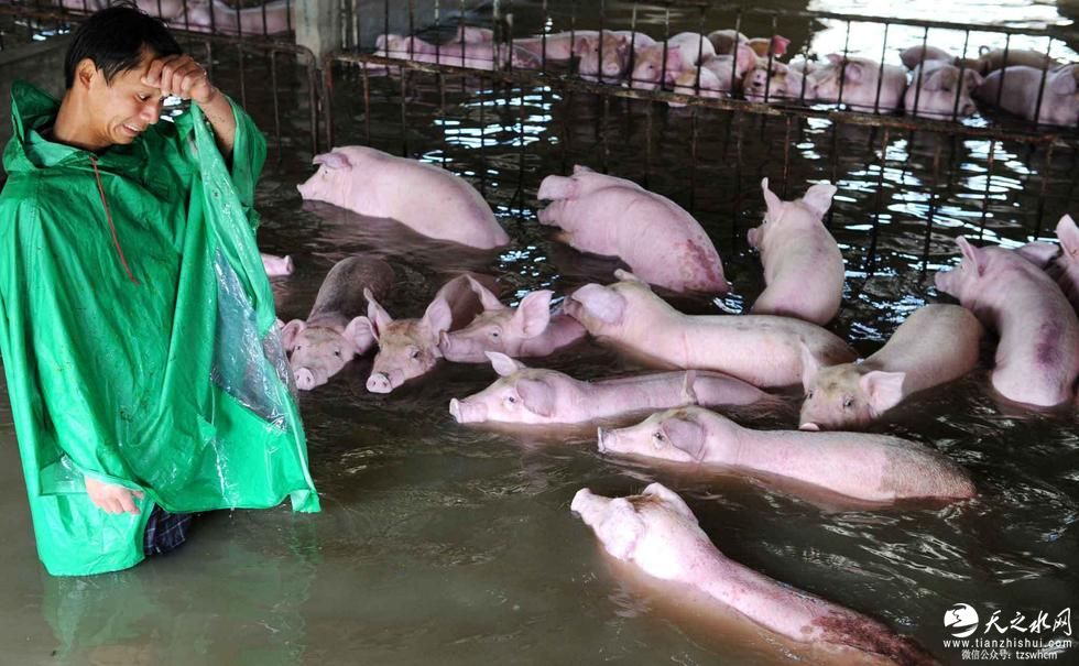 由于环保和防疫等限制,生猪无法转移,目前大雨持续,养殖场内水位继续上涨,留守场内的员工在撤离前最后一次涉水走进猪舍,与自己精心饲养的生猪诀别,场内6000余头生猪已无生存希望。图为李杰挥泪和浸泡在洪水中的生猪诀别。