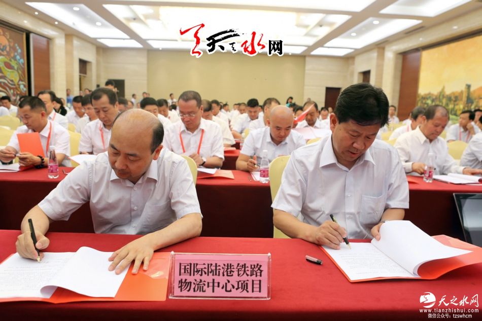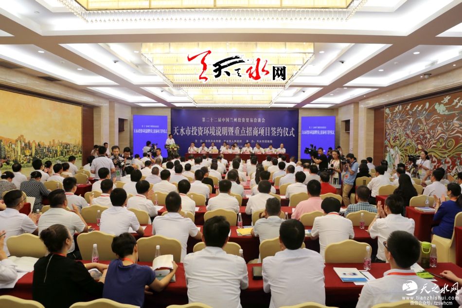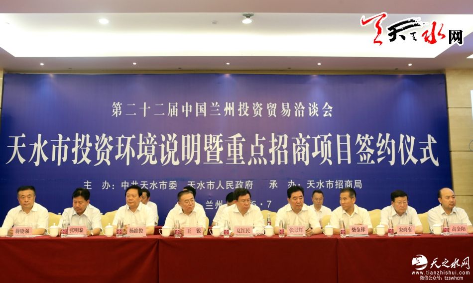 据天天天水网讯【记者冯丽娟】7月7日下午,第二十二届中国兰州投资贸易洽谈会天水市投资环境说明暨重点招商项目签约仪式在甘肃国际会议中心举行。第二十二届兰洽会期间,我市共签约重点招商引资项目113项,总投资609.93亿元,拟引资601.68亿元。 副省长夏红民,省政协副主席张景辉,市委书记王锐,市人大常委会主任柴金祥,市委副书记、市政协主席宋尚有,市委常委、副市长张明泰,市委常委、秦州区委书记雷鸣,市政府秘书长逯克宗,天水经济技术开发区管委会主任马小龙出席签约仪式。