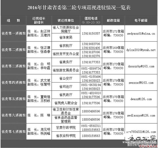据每日甘肃网7月8日兰州讯 (甘肃日报记者吕宝林)记者今天从省纪委获悉,2016年省委第二轮专项巡视各组已陆续进驻巡视单位,各巡视组全部公布了值班电话、邮政信箱和电子信箱。