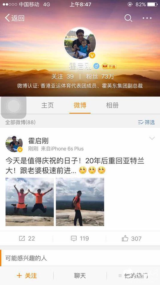 7月17日,微博久未更新的霍启刚,时隔22月再次发布微博,迅速引发网友围观。微博内容为:“今天是值得庆祝的日子!20年后重回亚特兰大!跟老婆极速前进…”他所说的20年前,恰恰是1996年郭晶晶首次参加奥运会(亚特兰大)的年份。微博发出后不到半小时,便收获一大波粉丝评论“活久见”、“终于找回微博密码了”、“蜜糖晶刚发糖了!”