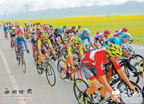 车手们骑行在门源县的油菜花海之间。兰州晨报特派记者 卢伟山 摄