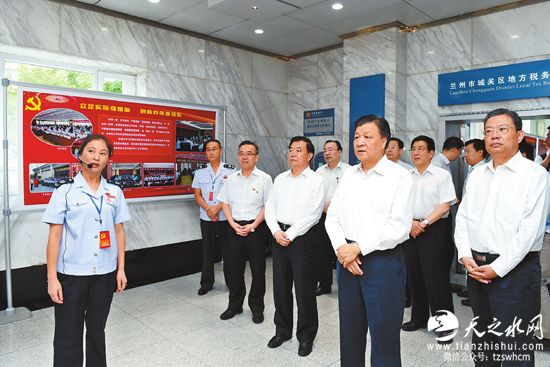 7月22日至24日,中共中央政治局常委、中央书记处书记刘云山在甘肃兰州调研。这是7月23日,刘云山在兰州城关区地方税务一局调研“两学一做”学习教育情况。新华社记者饶爱民
