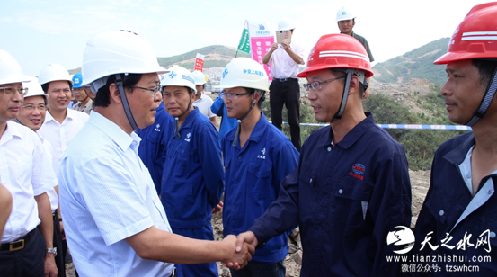在施工现场,车俊与该工程项目指挥部及中交、中铁等参建单位代表亲切握手交流,向头顶烈日、不畏艰辛坚持奋斗在施工一线的工程参建人员致以亲切的慰问。在观看了鱼山工程建设信息展板,并听取了鱼山工程总体规划和现阶段工程建设最新进展后,车俊充分肯定了鱼山工程各参建单位为顺利推进项目建设付出的努力,强调要继续保证工程质量,把握工程进度,特别要确保施工安全,做好防暑降温工作,保障一线员工的健康和安全,同时要求要把鱼山工程作为一项事业,在建设过程中不留隐患,不留遗憾。