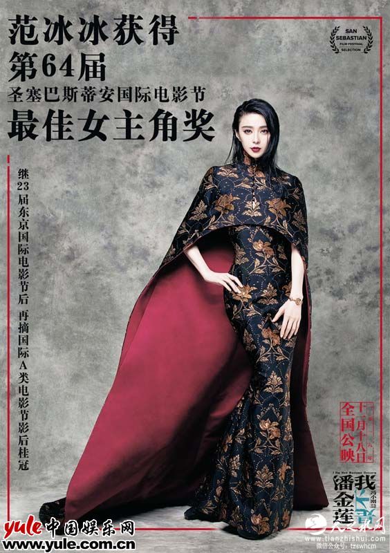 圣塞巴斯蒂安国际电影节于1953年创办,是西班牙举办的最早、最大的国际电影节,素有“西班牙国际电影节王后”之称,与戛纳电影节、柏林电影节、威尼斯电影节等同属国际A类电影节,在国际享有巨大影响力。电影《我不是潘金莲》是冯小刚、刘震云、范冰冰继电影《手机》之后12年来的再度合作,《手机》曾为范冰冰带来大银幕的第一个奖项“百花影后”,如今,获得圣塞巴斯蒂安国际电影节“最佳影片”金贝壳的《我不是潘金莲》又让她拿到了国际A类电影节影后桂冠。此外,《我不是潘金莲》还于近日入围了第41届多伦多电影节特别展映单元,并获得了多伦多电影节2016年国际影评人费比西奖,该片在多伦多、圣塞巴斯蒂安两地首映后,反响热烈,电影放映后掌声不断,其创新的表现手法和李雪莲的故事得到了许多国内外观众的啧啧称赞,外媒赞赏道:“范冰冰演出了一位单身女人的残酷无情、肆无忌惮,打造了一位非常真实的人物形象。她在一个全男性的阵容里掌握住了大局,并在一个基调低沉的角色中夺目地展现出了她的喜剧天赋。”据悉,《我不是潘金莲》将于11月18日登陆全国院线。