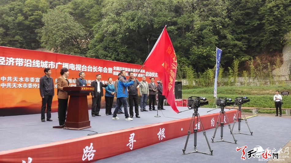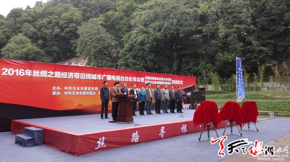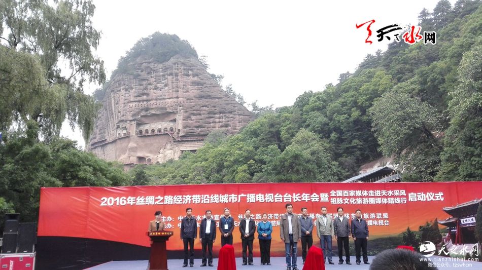 据天天天水网26日11时讯 【记者 刘晓亚】9月26日上午,2016年丝绸之路经济带沿线城市广电台长年会暨全国百家媒体走进天水采风、祖脉文化旅游圈媒体踏线行启动仪式在麦积山广场举行。