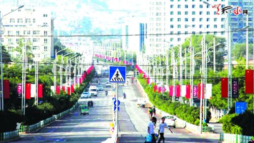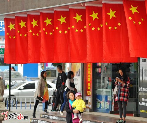 ▲国庆节将至,天水市各商场、街道悬挂国旗,喜庆祖国67岁华诞。图为9月29日记者拍摄的秦州区一家商场前悬挂的国旗。(天水日报记者 孙镇 摄)