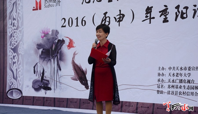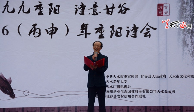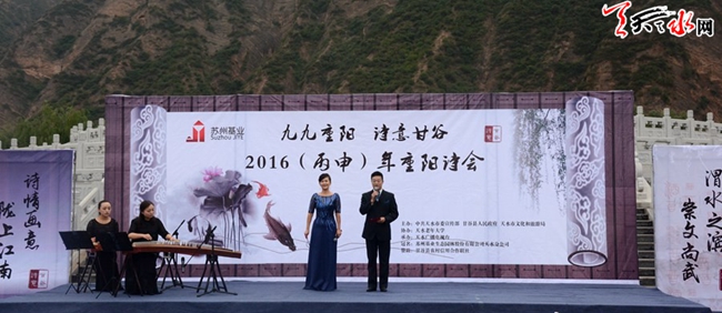 10月9日,正值重阳佳节。由天水市委宣传部、甘谷县人民政府、市文化和旅游局主办,市电视台承办,天水老年大学、天水市江苏商会甘谷分会协办的“九九重阳·诗意甘谷”2016(丙申)年甘谷重阳诗会在大像山公园成功举办。诗会以历代经典诗作、名家关于重阳的诗歌、反映甘谷特色的诗歌为主。深秋的甘谷,烟雨朦胧,广大诗歌爱好者欢聚大像山脚下,以诗抒情,以诗会友,共庆重阳佳节。诗会上,来自市县电视台、天水老年大学等单位的诗歌爱好者,采取诗歌与舞蹈相结合的方式,运用抑扬顿挫、字字珠玑的语言,全面展示了中华诗词古风雅韵和天水诗歌之美,为全县人民献上了一场别开生面的文化大餐。