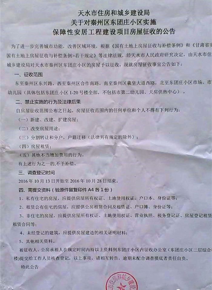 2016年10月10日,天水市住房和城乡建设局发布“关于对秦州区东团庄小区实施保障性安居工程建设项目房屋征收的公告”根据公告内容显示,此次房屋征收的范围,具体包括东团庄小区1-20号楼全部。其中,天水市第二幼儿园和天房供热中心不在征收范围。