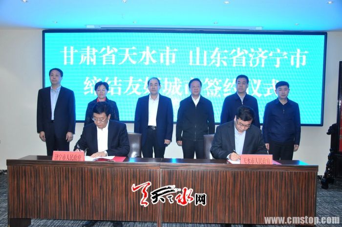 据天天天水网讯【记者冯丽娟】10月11日,天水市与山东省济宁市签约缔结为友好城市。天水市委副书记、市长杨维俊,济宁市委书记、市人大常委会主任马平昌出席签约仪式。
