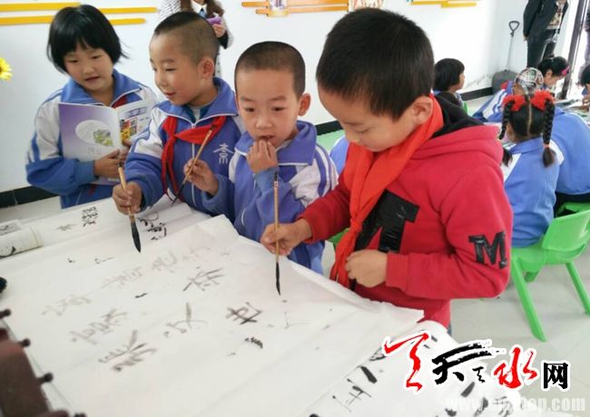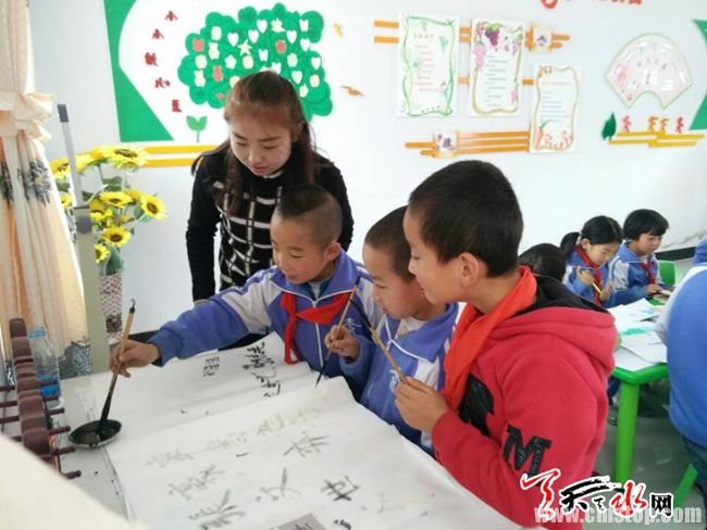 图为10月12日,二十铺村留守儿童之家的孩子在练习毛笔字。