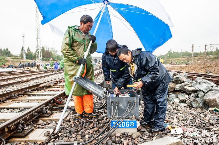 在当天7:30至15:30的封锁施工点内,全体参建员工冒着大雨,奋战在施工现场,共完成新建计算机联锁、TDCS及微机监测调试2站、区间轨道调试4区段、站内轨道区段调试试验78区段、信号机对位调试试验121架、道岔对位调试试验96组、相邻场联电路修改4站,合肥东枢纽内场联试验10个方向,室内既有设备拆除和室外既有废弃设备拆除各2站,同时配合站前插铺道岔及线路拨接等施工任务。实现了合芜铁路合肥东二、三、五场信号工程新联锁系统的开通启用。