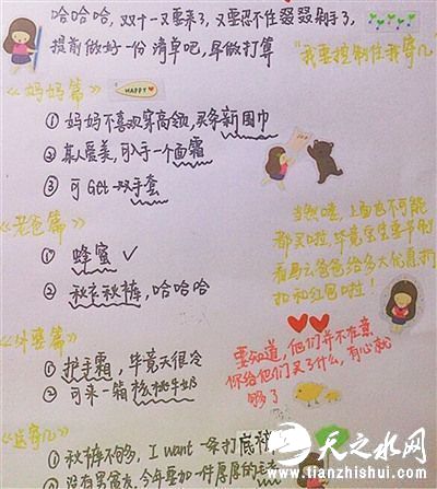 扬子晚报讯(通讯员季金晶王非凡记者陈咏)昨天,网上晒出几张特别的“双十一感恩购物清单”,记者获悉,这几张清单是扬州大学信息工程学院三名女生集体制定的,三位“乖乖女”在“双十一”感恩父母,列出给老爸老妈的购物清单,恰到好处地传递温情,引起众多网友点赞。