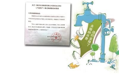 2015年,江苏省消协开展四大公共服务行业消费者满意度调查。有消费者反映,居民《供用水合同》的格式条款存在侵害消费者权益的情况。2015年12月,省消协组织了专家审查,并于2016年1月18日召开新闻发布会,发布了我省多地供水合同中普遍存在的、侵害消费者权益较为严重的规定违约金过高等6方面不平等格式条款问题,并委托各市消协约谈企业整改。