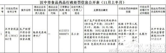 其中包括:勉县龙泉纯净水厂被抽检的产品(标示生产日期:2016年7月4日,规格:18.9L/桶,保质期:30天)在国家食品安全监督抽检中,检出铜绿假单胞菌项目不符合国家相关标准要求;