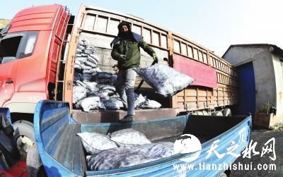 11月13日,秀川崔家崖村煤碳配送站新增40吨洁净型煤,这是冬防以来,崔家崖村民刚刚使用完160吨洁净型煤后,新增的第二批洁净型煤。七里河区环保局相关负责人介绍,目前辖区共发放2.5万吨洁净型煤,助力冬防工作。记者看到,刚刚从兰州清洁型煤配送中心购进的40吨洁净型煤已搬运入库,不时有村民前来购煤。“这种新型煤具有热点高、起火快、低灰粉、低含硫、节能清洁的特点,政府每吨煤补贴300元钱,受到村民的欢迎,每天可销售20多吨洁净型煤”。煤碳配送站一位工作人员称。图为工作人员正在搬煤入库。