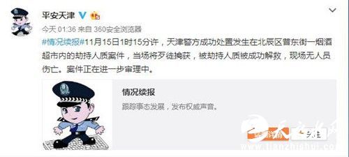人民网北京11月15日电据天津市公安局官方微博消息,11月15日1时15分许,天津警方成功处置发生在北辰区普东街一烟酒超市内的劫持人质案件,当场将歹徒擒获,被劫持人质被成功解救,现场无人员伤亡。案件正在进一步审理中。