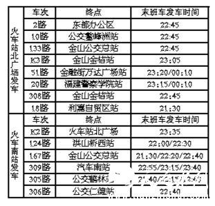 火车南站发车的车辆中,最晚的一班为309路,发车时间为23时40分。节假日客流高峰期延时线路调整为7条、31趟,其中309路增开班次达10趟,最晚的仍为23时40分。