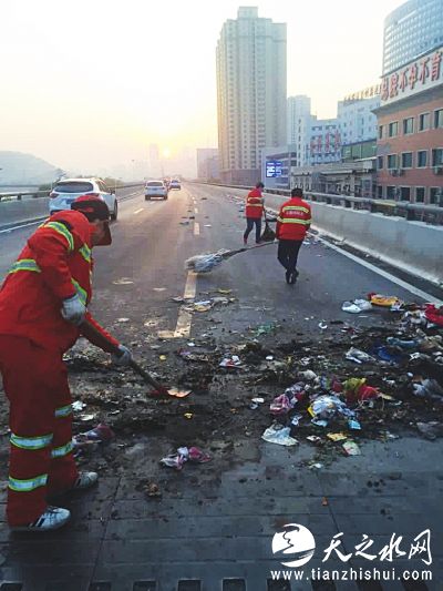 11月15日,天刚蒙蒙亮,清晨6时50分,七里河区环卫局五队环卫工人,准备对小西湖立交桥各个路段进行清扫保洁作业时,发现北滨河路西向东直行桥面、立交桥东西引桥弯处路面堆积大量生活垃圾,除了塑料袋、果皮纸屑甚至还有粪便等。