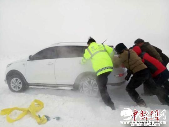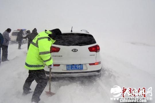 哈巴河县境内道路遭遇风吹雪天气,警方出动警力300余人参与救援。吾木提别克摄