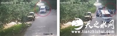 视频显示,事发后,路东侧(车头朝北)迅速冲出一辆巡逻车,该车驶往路西侧的平台附近停下。从视频上看,巡逻车被树枝挡住。15时01分,白色速腾车驾驶座上的蓝衣男子——赵女士爱人走到巡逻车附近,徘徊了好一阵。