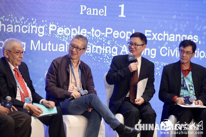 论坛现场(左起:特拉维夫大学战略研究中巴里·萨瓦尔斯、阿里巴巴大文娱战略和投资委员会主席古永锵、主持人周黎明、作家,中央电视台制作人布莱恩·索尔特)朱兴鑫 摄