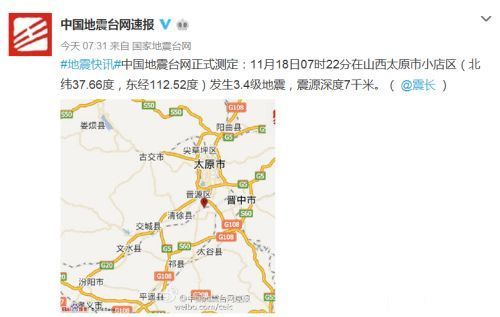 山西太原市小店区发生3.4级地震 震源深度7千米 2016-11-18 10:49 中新网 我要评论0 中新网11月18日电据中国地震台网正式测定:11月18日07时22分在山西太原市小店区(北纬37.66度,东经112.52度)发生3.4级地震,震源深度7千米。 微笑 流汗 难过 羡慕 愤怒 流泪 相关阅读 关键词: 救援,骗局 复制网址 打印 收藏 0