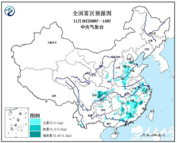 中国天气网中央气象台11月18日06时发布大雾黄色预警: