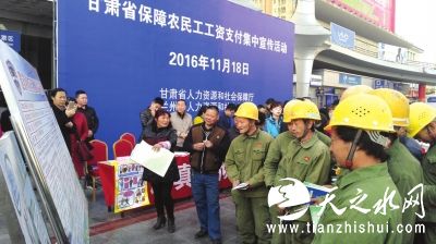 中国甘肃网11月19日讯 据兰州晚报报道(首席记者 孙建荣 记者 朱浩源 实习生 刘家良 文/图)11月18日,由省人力资源和社会保障厅和兰州市人力资源和社会保障局牵头的省市区12个部门“保障农民工工资支付集中宣传活动”在兰州火车站广场举行,上千名农民工现场学习普及了维权知识。同时,市人力资源部门负责人呼吁,农民工要理性维权、依法维权、坚决打击恶意讨薪违法行为。