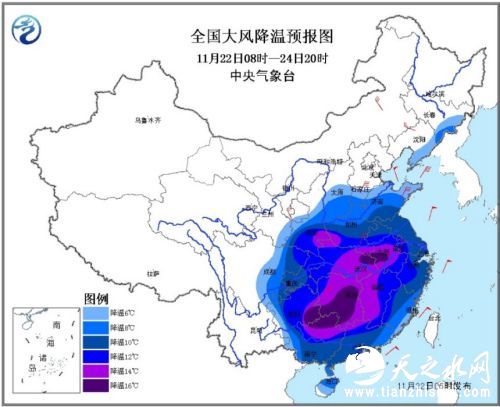 其中,陕西南部、黄淮南部、江淮中西部、江汉、江南中西部、华南北部以及四川东北部、重庆东部、贵州中东部等地气温将下降12~14℃,湖南中南部、贵州东南部、广西北部等地的部分地区降温可达16℃以上。上述地区伴有4~6级偏北风,东部和南部海区风力有7~8级,阵风9~10级。