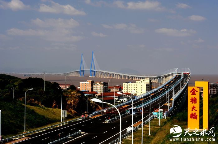 金塘大桥在海面上蜿蜒盘旋,柔美的曲线,优雅的弧度,在桥跨之间柔顺的连续展开,就像一条轻柔的飘带,系在岛礁与海面之上,给人以强烈的美感和无限的遐想。海天蓝索塔如镶嵌在海洋里的两颗钻石,直指苍穹,高大挺拔,给人以积极进取、顽强拼搏的心灵感召。斜拉索虚实相间,明暗协调,井然有序,远远望去如同一架巨大的竖琴,在海风的吹动下,天籁之音隐约可闻。工程和艺术在这里交融。艺术的想象因工程而变为现实。就像是一首凝固的交响曲,奏出工程与艺术的和谐乐章。