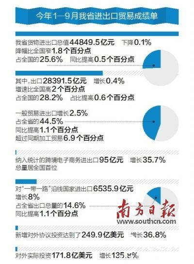作为外贸大省,通过制定实施《促进外贸回稳向好实施方案》,我省巩固了出口市场份额,推动外贸向优进优出转变。1—9月,广东省一般贸易进出口增长2.5%,占全省的44.5%,同比提高1.1个百分点,超过同期加工贸易6.9个百分点;其中一般贸易出口前50名企业出口增长20%,占全省一般贸易出口总值的29.8%,同比提高4.4个百分点。