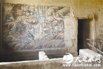 晋中市榆次区“东左付村圣安寺”壁画被盗前的样子,红圈处为壁画被盗的主要部分