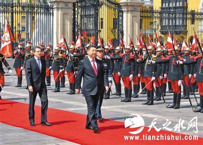 11月21日,国家主席习近平在利马同秘鲁总统库琴斯基举行会谈。会谈前,习近平出席库琴斯基在总统府前广场举行的欢迎仪式。新华社记者李涛摄