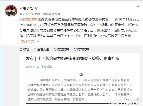 人民网太原11月23日电(乔慧)据山西长治市公安局官方微博“@平安长治”消息,11月22日上午10时许,山西长治医学院附属和平医院院内发生一起暴力伤医案件。长治市公安局城区分局接到市公安局指挥中心处警指令后,迅速出警,及时展开侦办工作。犯罪嫌疑人彭某某于当日上午11时许,已到长治市公安局城区分局英雄南路派出所投案。目前,犯罪嫌疑人彭某某以涉嫌故意杀人犯罪已被立案侦查。案件正在进一步侦查中。