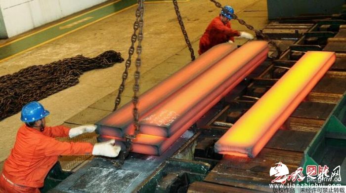 图为两名员工在吊运轧制的模具扁钢刘德斌/摄
