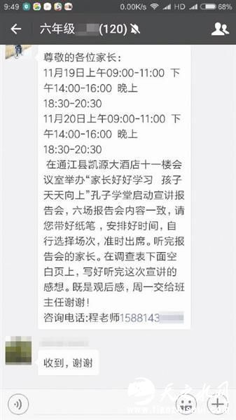 11月17日,四川省通江县实验小学的家长收到老师发在班级群的通知,请家长安排时间到当地某酒店听报告会,随后,孩子带回调查表,调查表称“参会后务必认真填写调查,并交给班主任”。