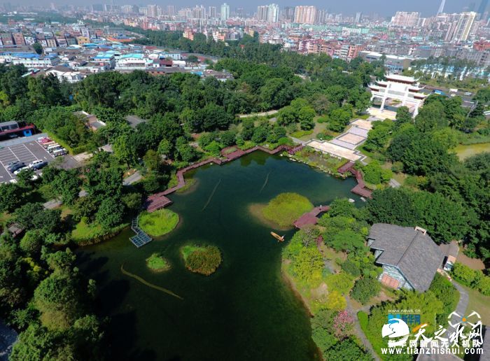 航拍海珠湿地门口牌坊,入口处即有碧水清湖。新华网发凌志摄
