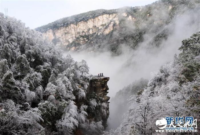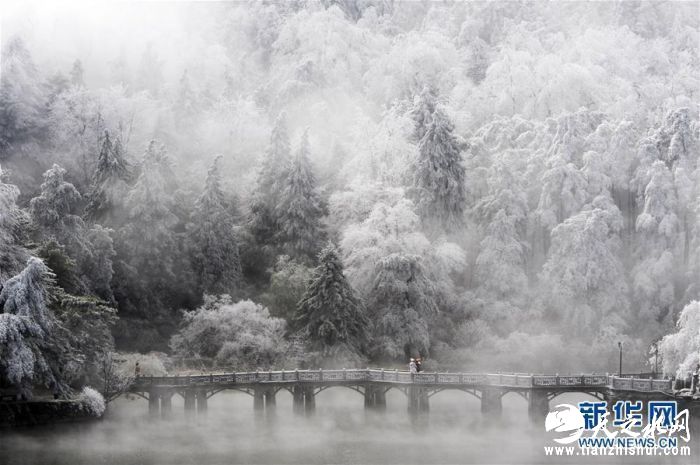 11月24日,游客在江西庐山欣赏雾凇景色。近日,受强冷空气影响,江西庐山迎来降雪,并出现雨凇、雾凇等景观,苍翠的山岭银装素裹,分外妖娆。新华社发(胡国林摄)